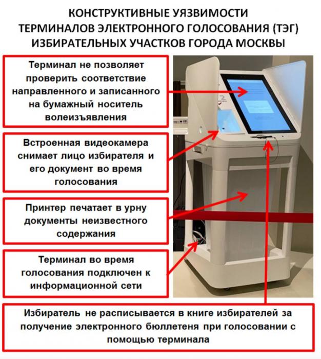 Грубыми ошибками в конструкции московских КЭГ являются отсутствие контроля со стороны избирателей напечатанного волеизъявления, встроенный сканер паспорта, позволяющий нарушать тайну голосования, и прямое подключение терминала к информационной сети во время голосования. Кроме того, за получение бюллетеня избиратель не расписывается.