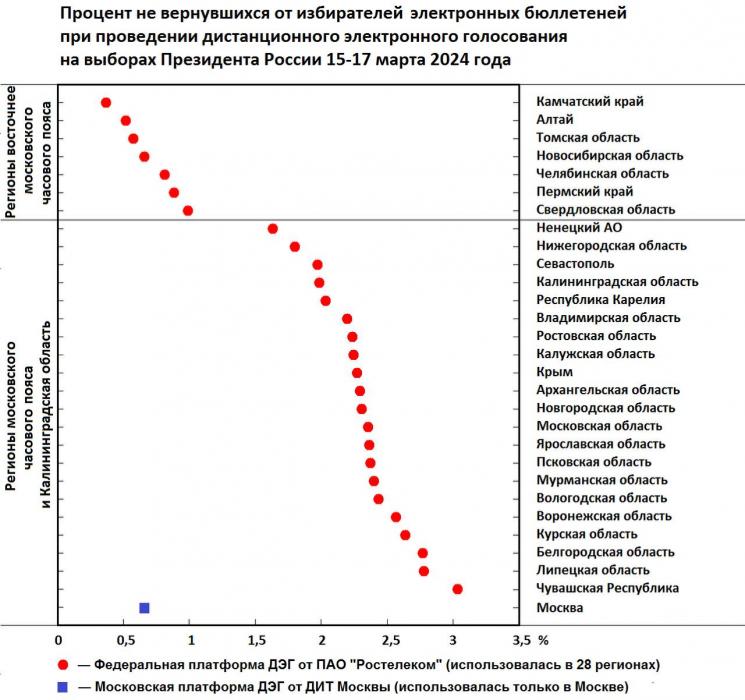 1) Как уже подробно описывалось в одном из предыдущих разделов настоящего отзыва, 15 марта 2024 года, в первый день президентских выборов, на систему ДЭГ была организована хакерская атака, в результате которой в этот день пострадало около 85 тыс. избирателей, в основном, московского часового пояса и Калининградской области. Согласно данным протокола об итогах ДЭГ именно столько избирателей получили бюллетень, но заполненный бюллетень от них в систему не вернулся. Процент не вернувшихся бюллетеней в западных регионах, в которых с утра первого дня голосования началась хакерская атака, оказался почти на порядок больше, чем в восточных регионах России, где использовалась федеральная система ДЭГ и голосование началось раньше, до начала хакерской атаки.
